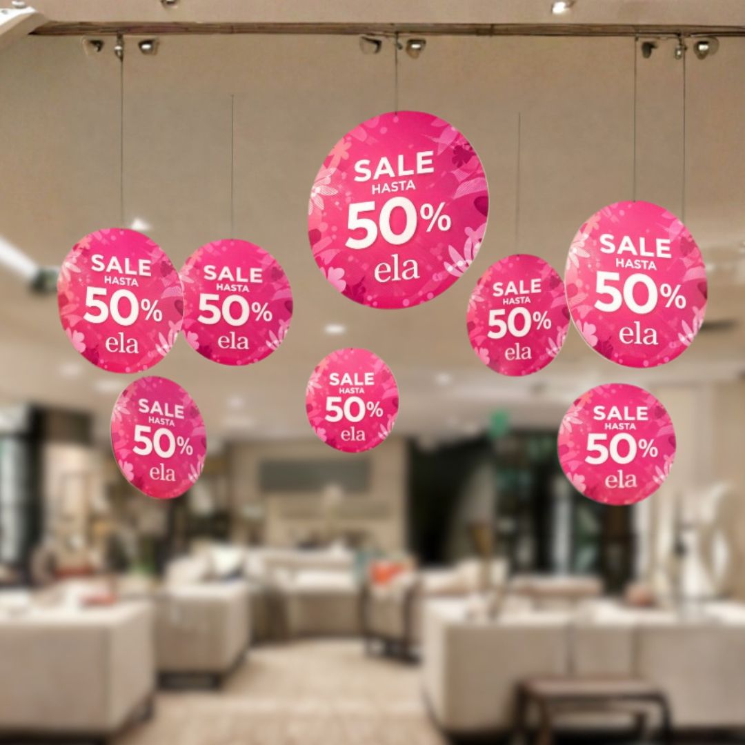 Aéreo doble cara pack de 8 colgantes en cartón para campañas, vitrinas y activaciones